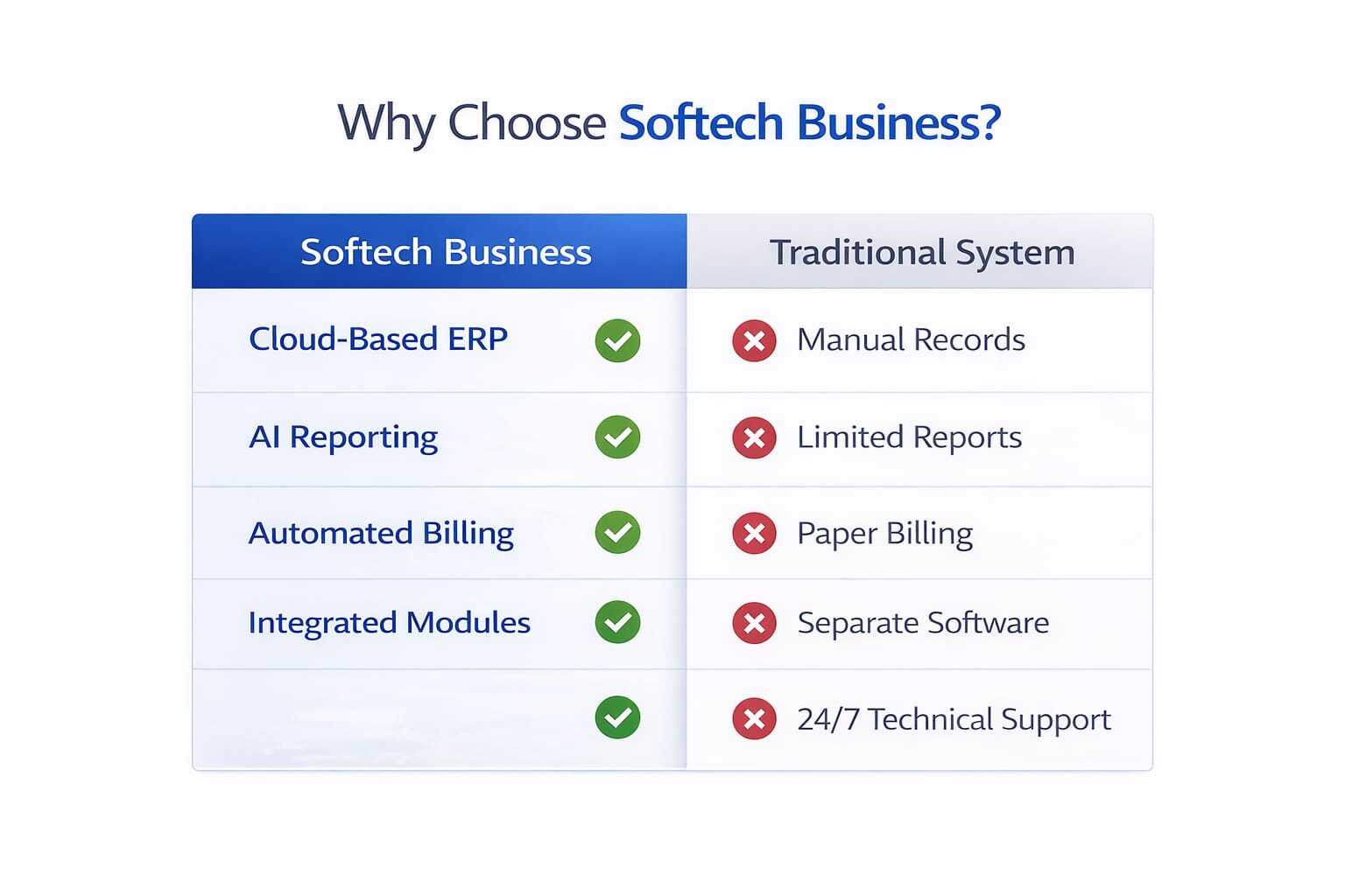 Softech Business offers complete healthcare management solutions including Hospital ERP, Patient Management System, HRMS, Payroll, Pharmacy & Inventory Management, Appointment Scheduling, and AI-based reporting tools.